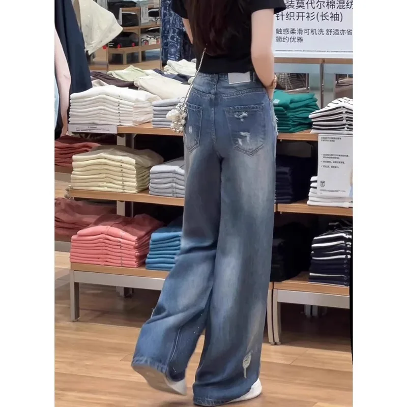 American Trend Irregular Hole Vintage Jeans Women's Distressed Washed Wide Leg Straight Denim Pants 2025 New Trousers